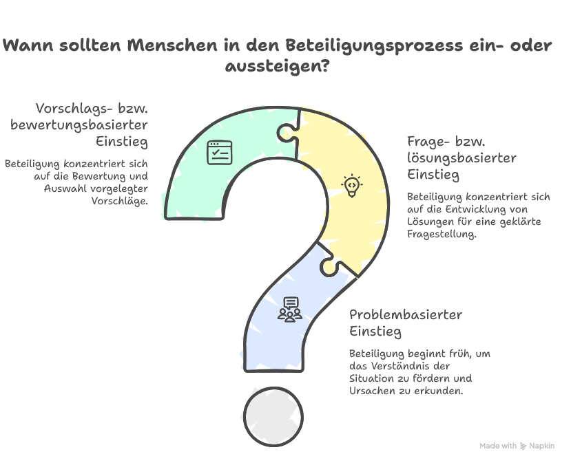 Die Fragestellung ist bereits geklärt, und die Beteiligung setzt bei der Entwicklung von Lösungen ein. Menschen werden gezielt einbezogen, um Optionen zu entwickeln, zu durchdenken und auszuarbeiten.